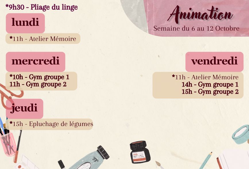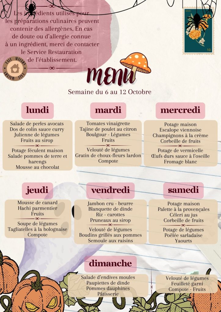 Vous trouverez les repas des résidents de la semaine et le planning des animations.