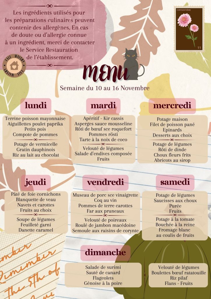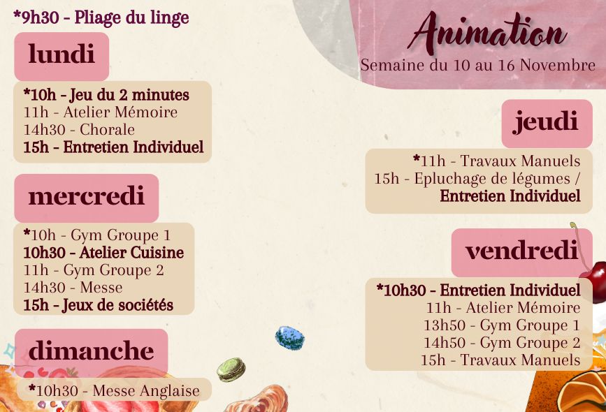 Vous trouverez les repas des résidents de la semaine et le planning des animations.