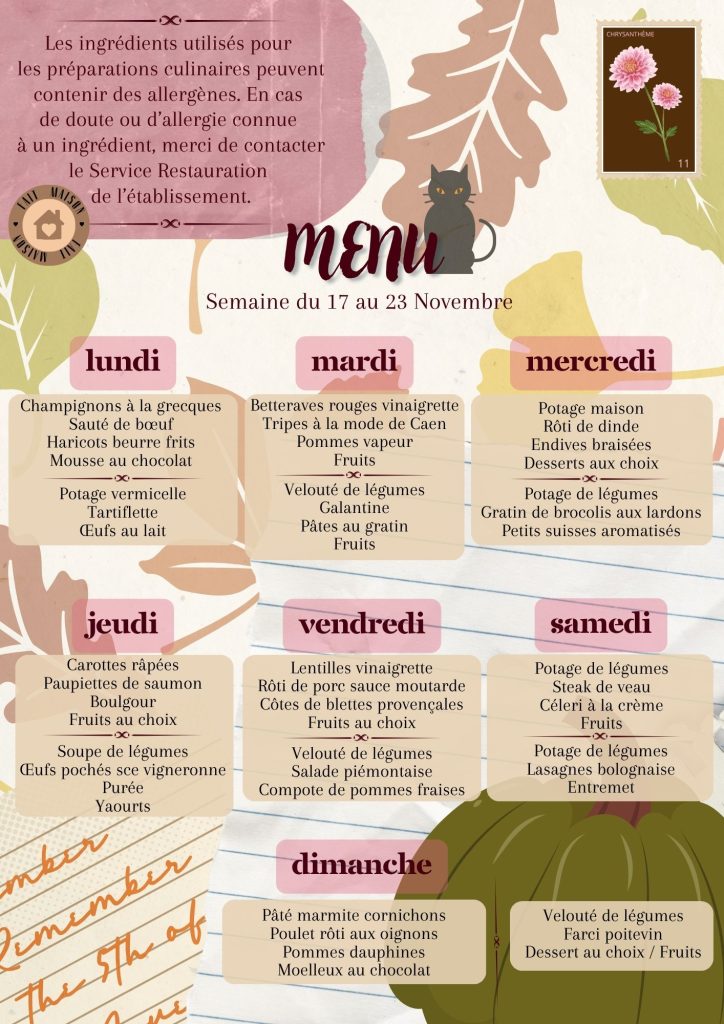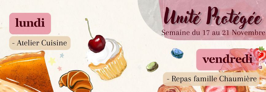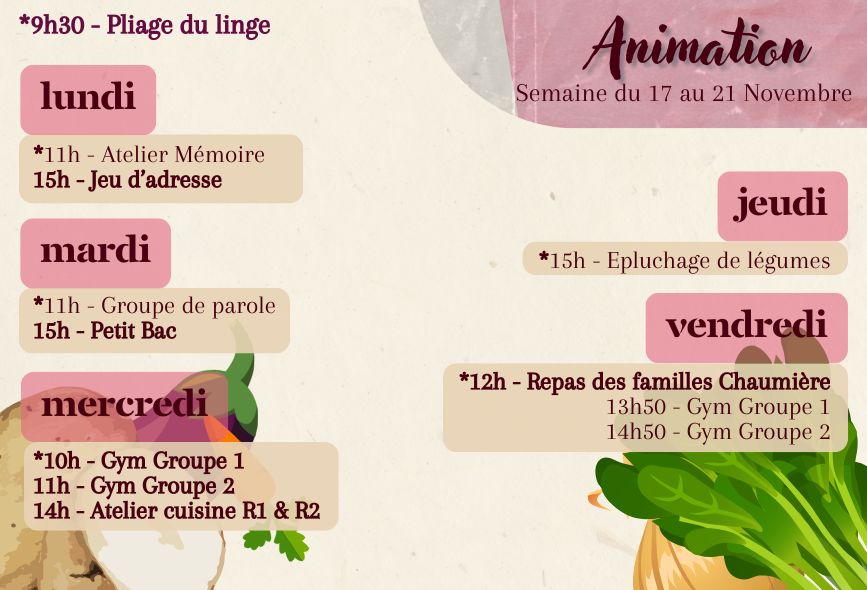 Vous trouverez les repas des résidents de la semaine, le planning des animations et le planning des animations de l’Unité Protégée.