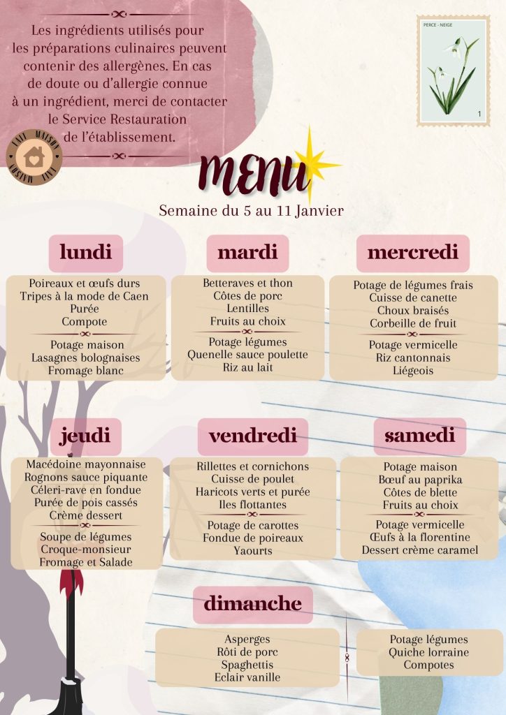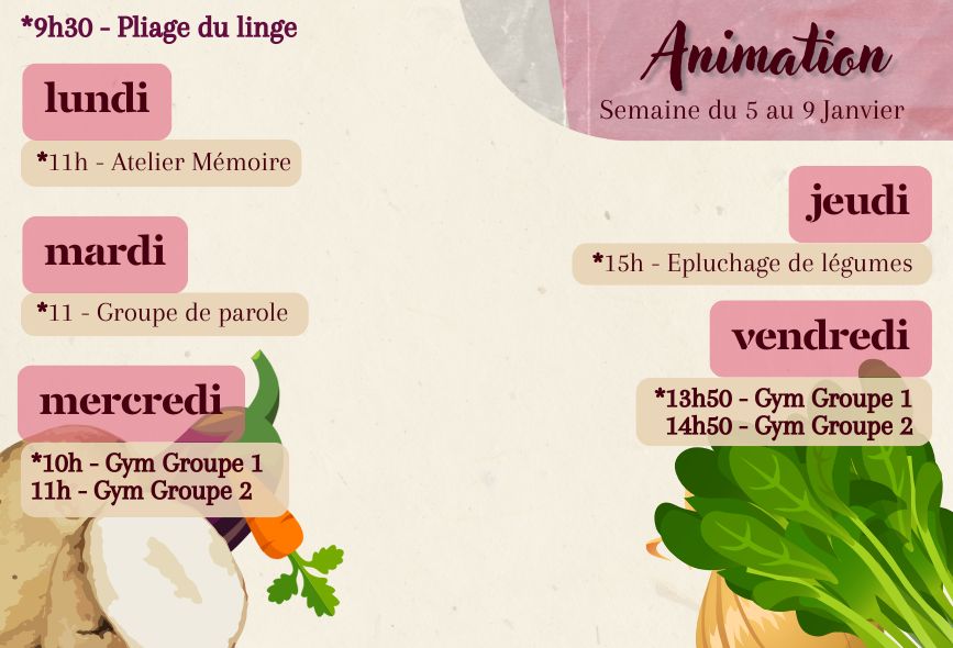 Vous trouverez les repas des résidents de la semaine et le planning des animations.