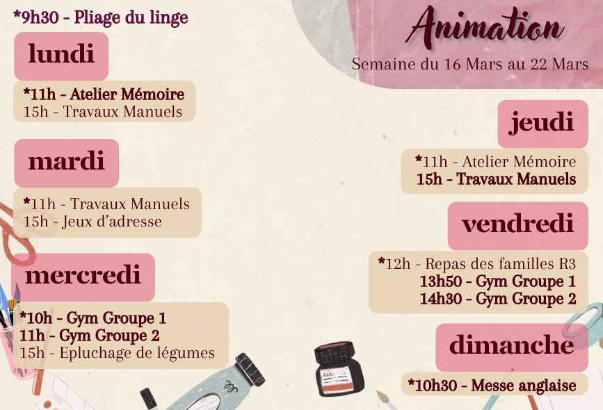 Vous trouverez les repas des résidents et les animations de la semaine.