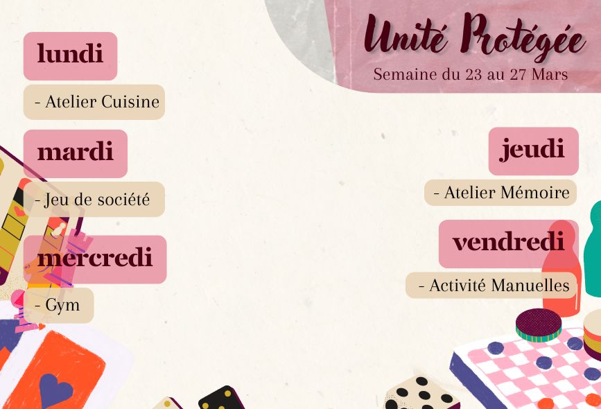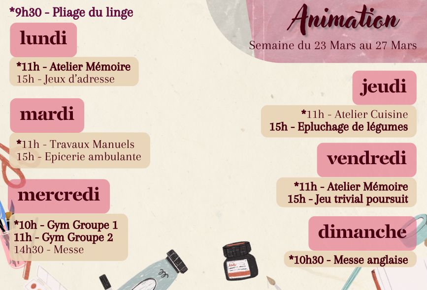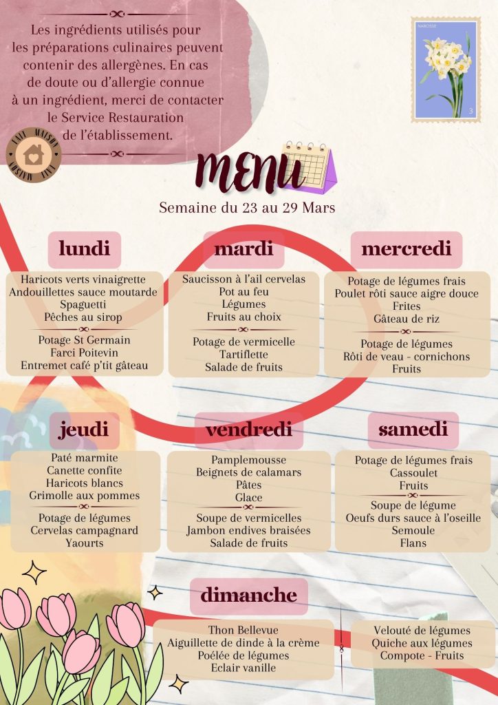 Vous trouverez les repas des résidents et les animations de la semaine.