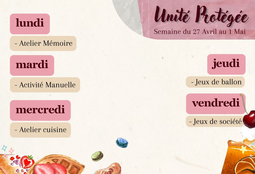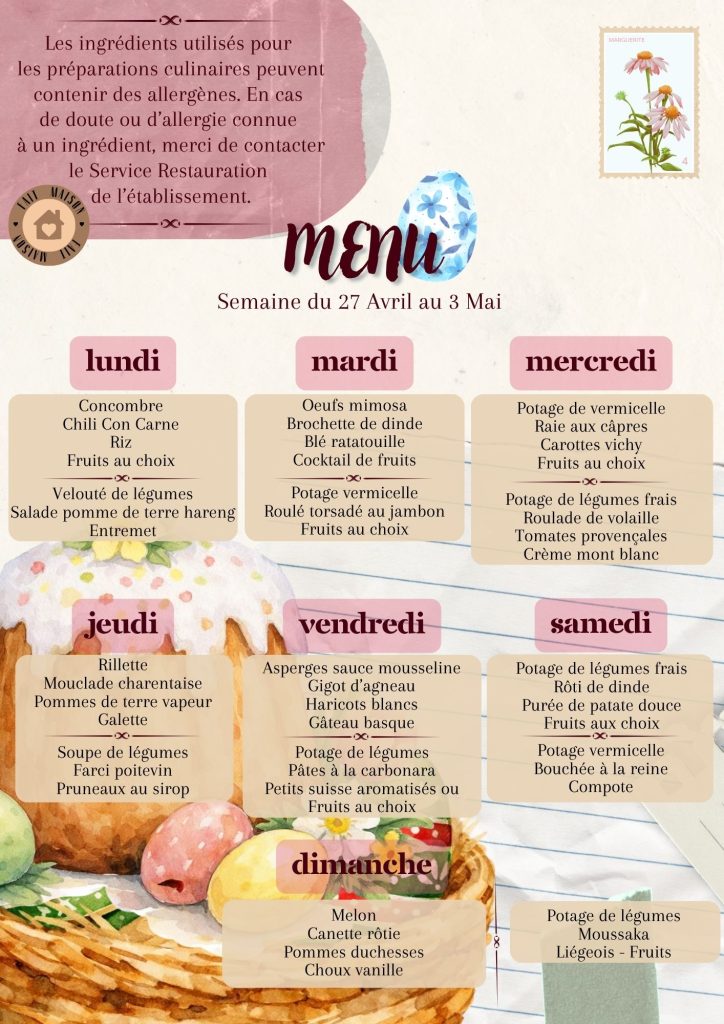 Vous trouverez les repas des résidents et les animations de la semaine.
