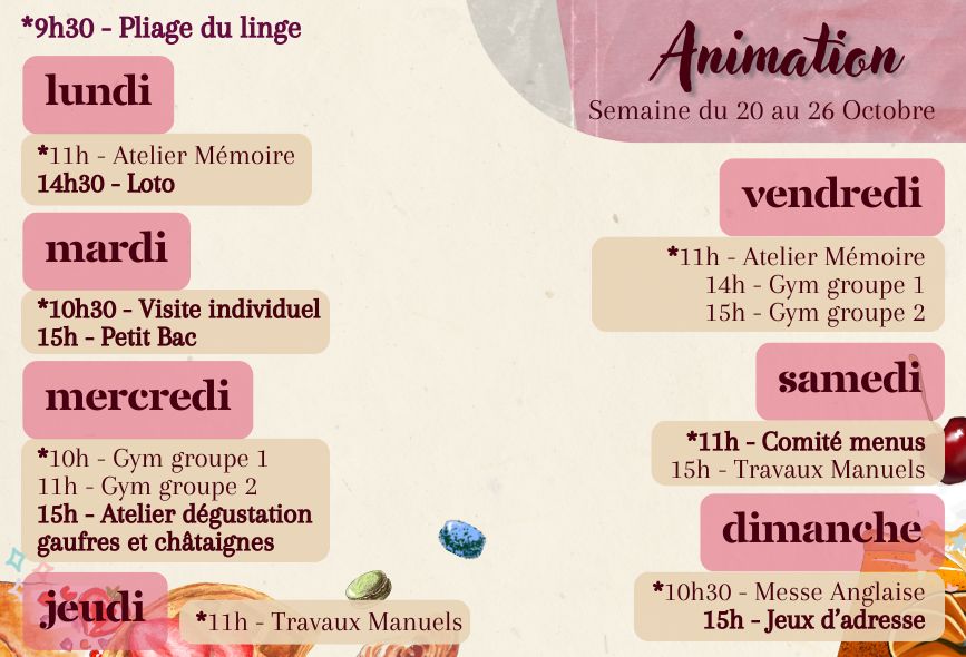 Afin de maintenir les habitudes de vie des résidents, et de favoriser la vie sociale et culturelle, des activités sont proposées. La participation aux différents ateliers et sorties s’effectue sur la base du volontariat, afin de respecter les souhaits de chacun.